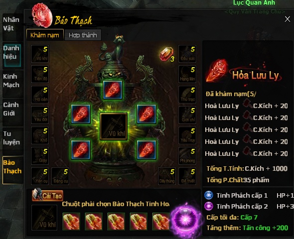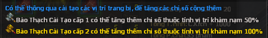 Chức năng cải tạo bảo thạch giúp tăng thêm các thuộc tính cơ bản của trang bị (VD: Vũ Khí tăng Công Kích)