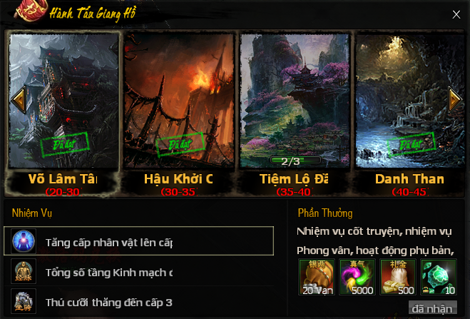 Trong mỗi cấp sẽ có các yêu cầu khác nhau về cấp độ Cảnh Giới, Võ Học, Bảo Giáp, Thú Cưỡi ... Đại hiệp sau khi hoàn thành sẽ nhận được phần thưởng tương ứng như Chân Khí, Lễ Kim, Ngân Lượng, Lượng Ngân Sa ...