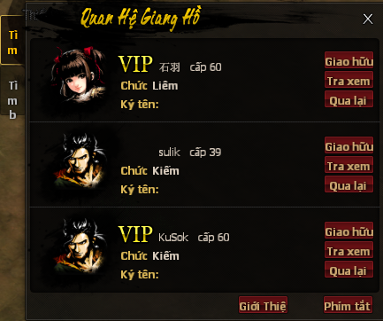 Ngoài ra, game cũng hỗ trợ tính năng Quan Hệ Giang Hồ cho nhân sĩ võ lâm. Tại đây đại hiệp có thể tìm kiếm các thông tin như: