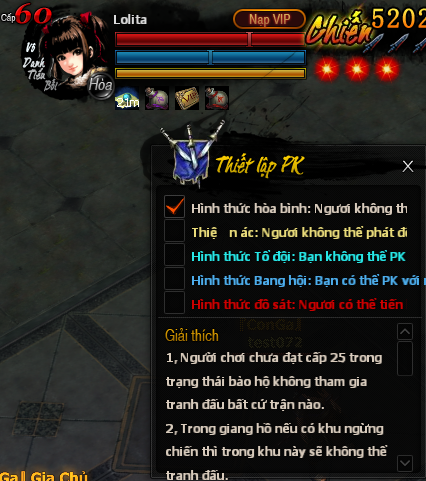 - Hiệp: Thưởng thiện phạt ác, có thể giết kẻ ác (màu đỏ - đã pk người khác) nhưng không thể giết người thường