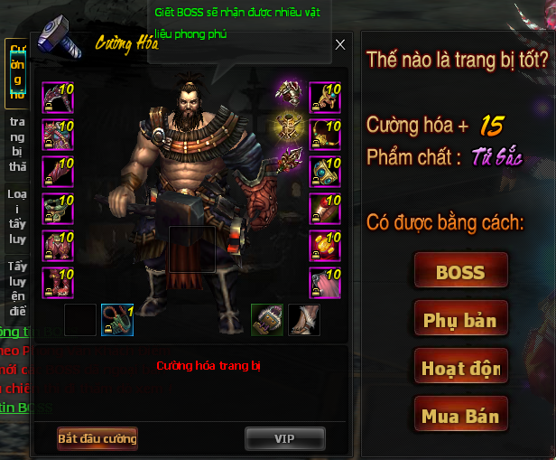 Hệ thống cường hóa chia làm các nhóm khác nhau. Mỗi nhóm đóng vai trò và chức năng riêng trong quá trình gia tăng sức mạnh cho trang bị. Thợ rèn sẽ đích thân chế tạo trang bị cực phẩm cho đại hiệp, cùng đại hiệp luyện chế, kề vai tác chiến. Đại hiệp thành công, y sẽ chúc phúc, thất bại, y sẽ dạy một chút bí quyết thành công.